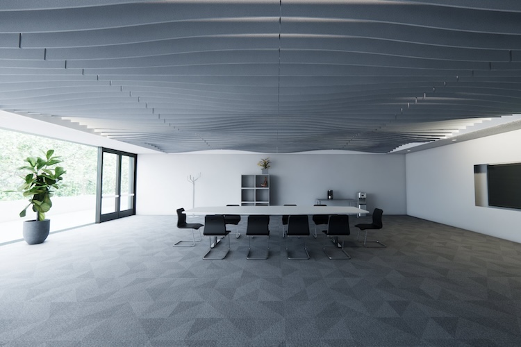 Acoustic performance depends on material type, baffle depth, spacing, and suspension height.